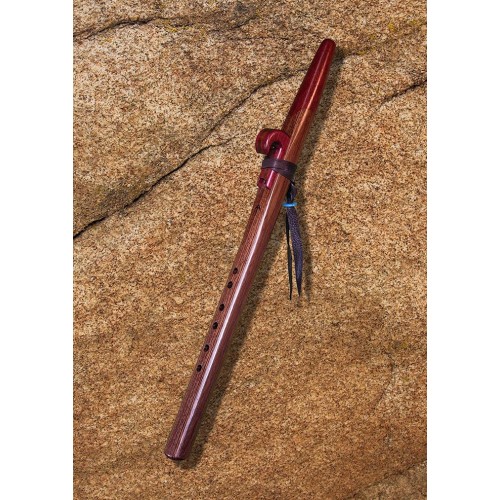 In this Native American style flute I have combined North American walnut and South American purpleheart. Because the barrel of the flute is made of the medium dense walnut the tonal quality is a bit mellower than some of the denser wood flutes. The flute is also a bit lighter in weight than the purpleheart or bubinga.